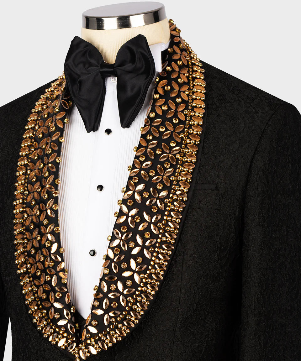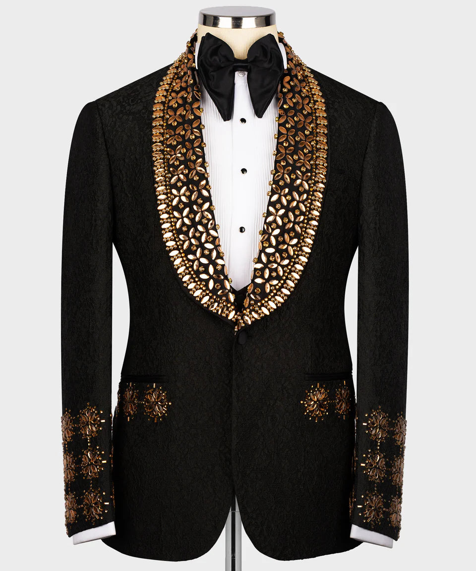 Te presentamos el esmoquin diseñado por MUGOZA, que combina lujo y elegancia y está decorado con piedras naturales. Fabricado con material de lana de seda de alta calidad, este elegante esmoquin no solo realza la textura del esmoquin, sino que también presenta piedras distintivas que lo hacen verdaderamente único.