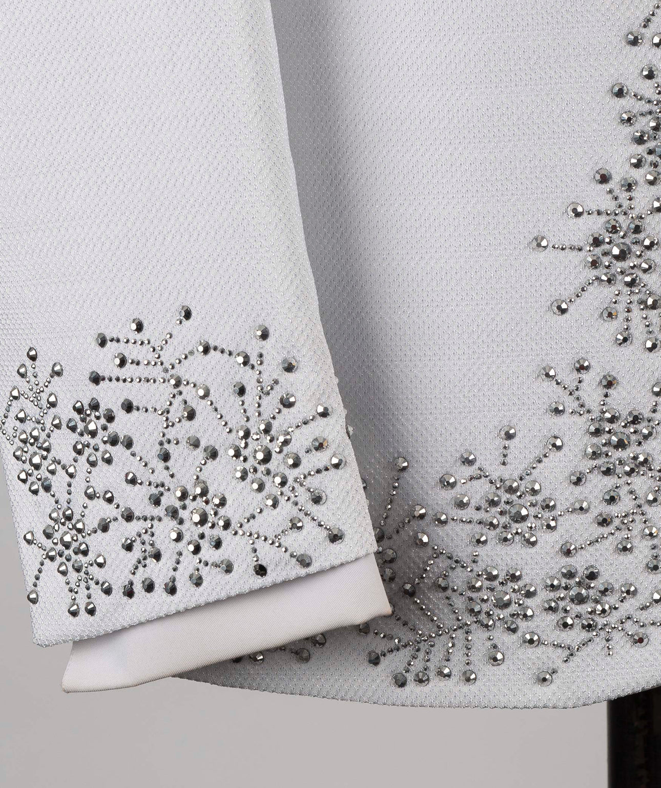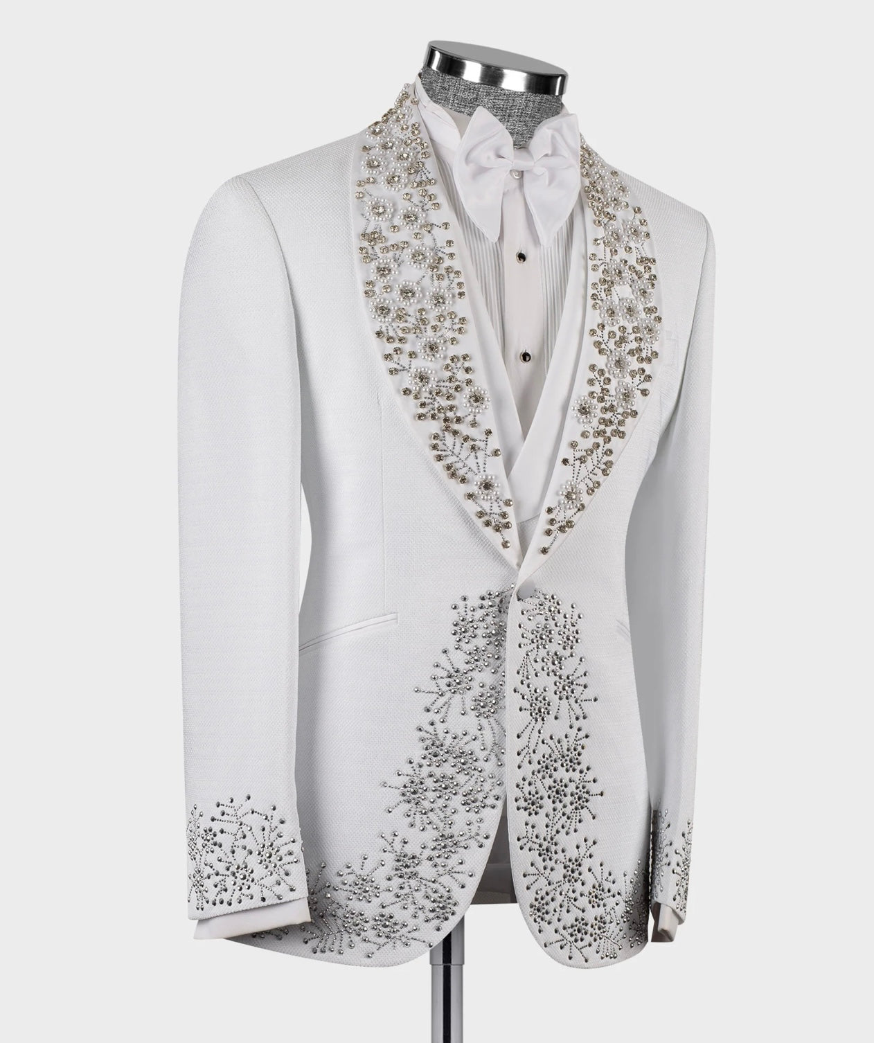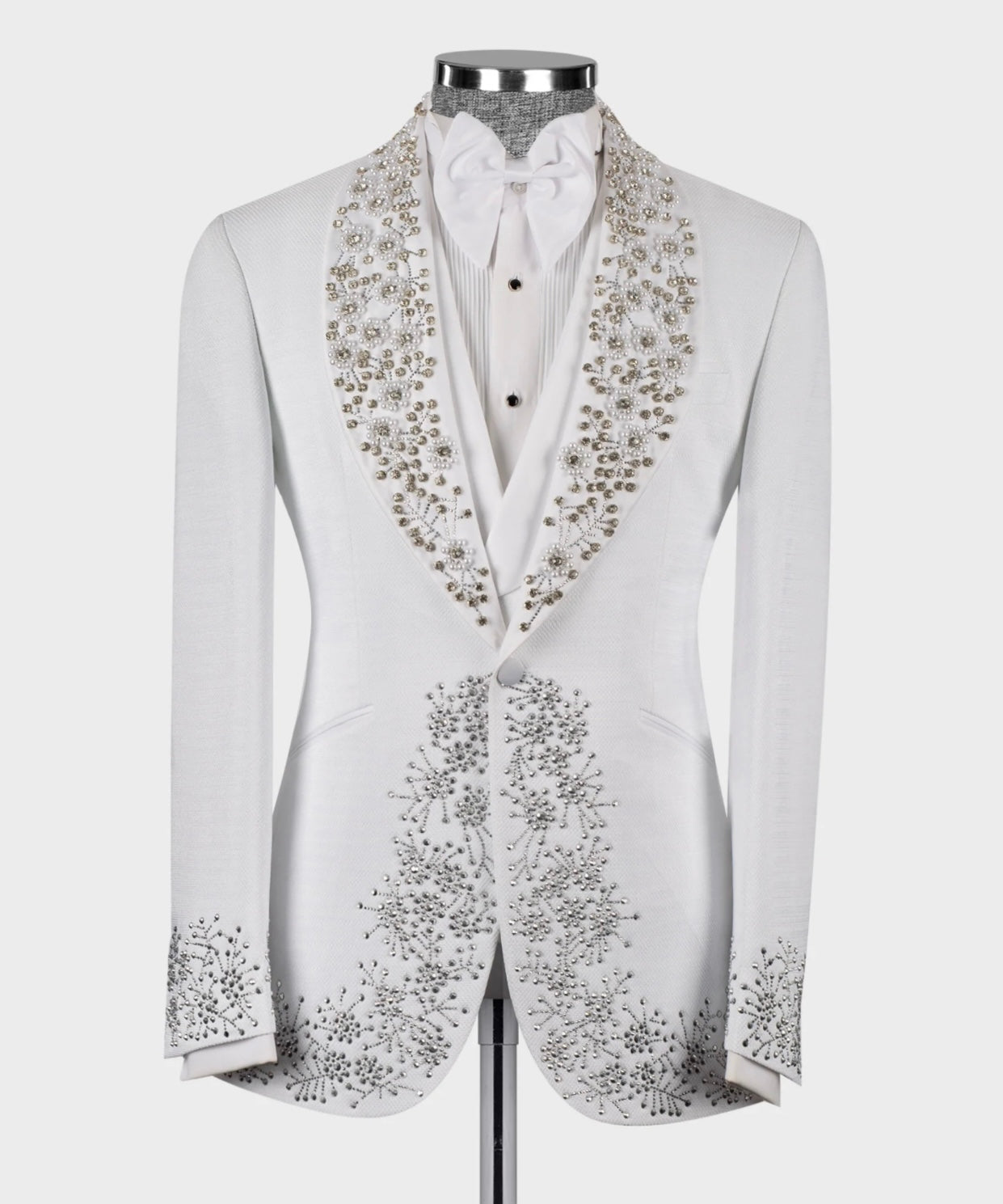 Te presentamos el esmoquin diseñado por MUGOZA, que combina lujo y elegancia y está decorado con piedras naturales. Fabricado con material de lana de seda de alta calidad, este elegante esmoquin no solo realza la textura del esmoquin, sino que también presenta piedras distintivas que lo hacen verdaderamente único.