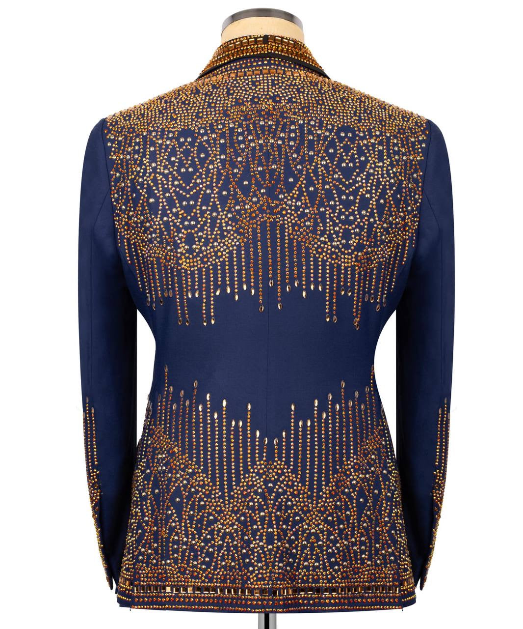 This tuxedo is more than just attire; it is a masterpiece that shines under the spotlight. The carefully selected premium fabric is adorned with gold crystal stones, blending elegance with brilliance.