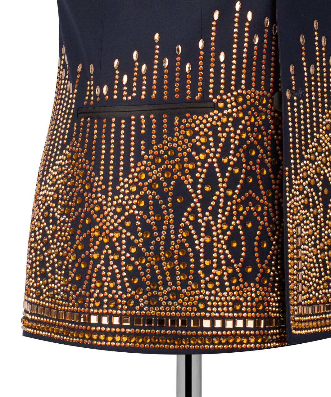This tuxedo is more than just attire; it is a masterpiece that shines under the spotlight. The carefully selected premium fabric is adorned with gold crystal stones, blending elegance with brilliance.