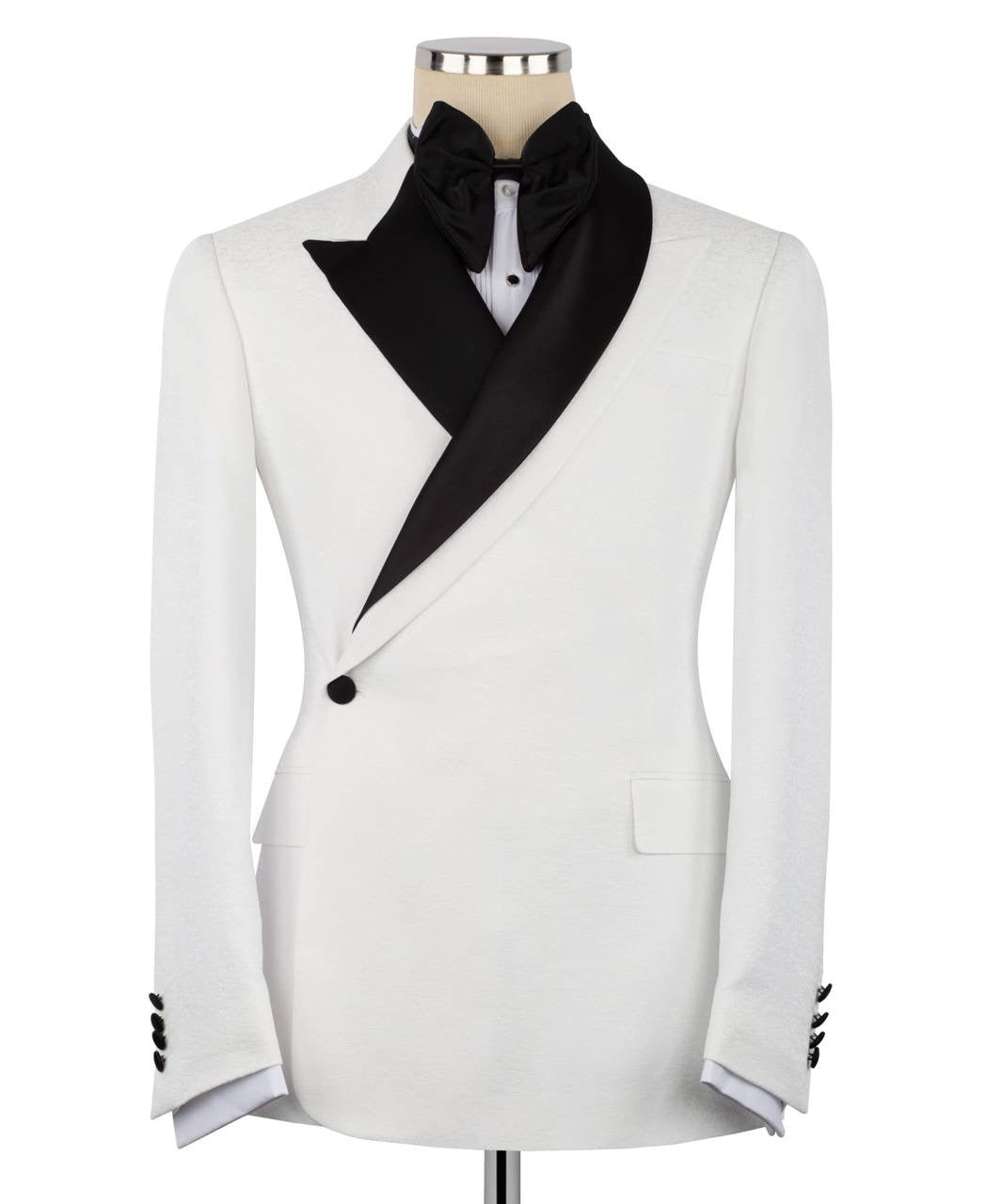 This white asymmetric tuxedo suit delivers a striking and elegant presence for formal occasions. The jacket is designed with a refined diagonal one button closure and a contrasting black satin lapel, creating a bold yet timeless formal silhouette.